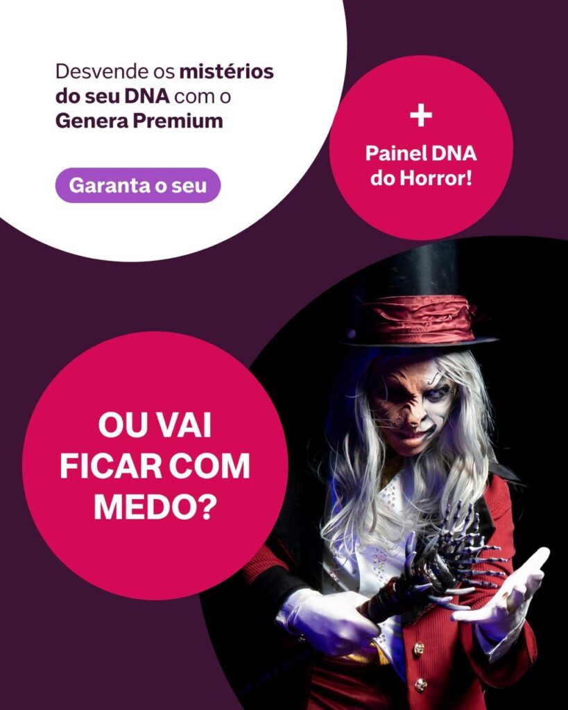 Ao adquirir o pacote Genera Premium pela página da parceria, você garante acesso gratuito ao exclusivo Painel do Horror, onde poderá explorar os mistérios do seu DNA.